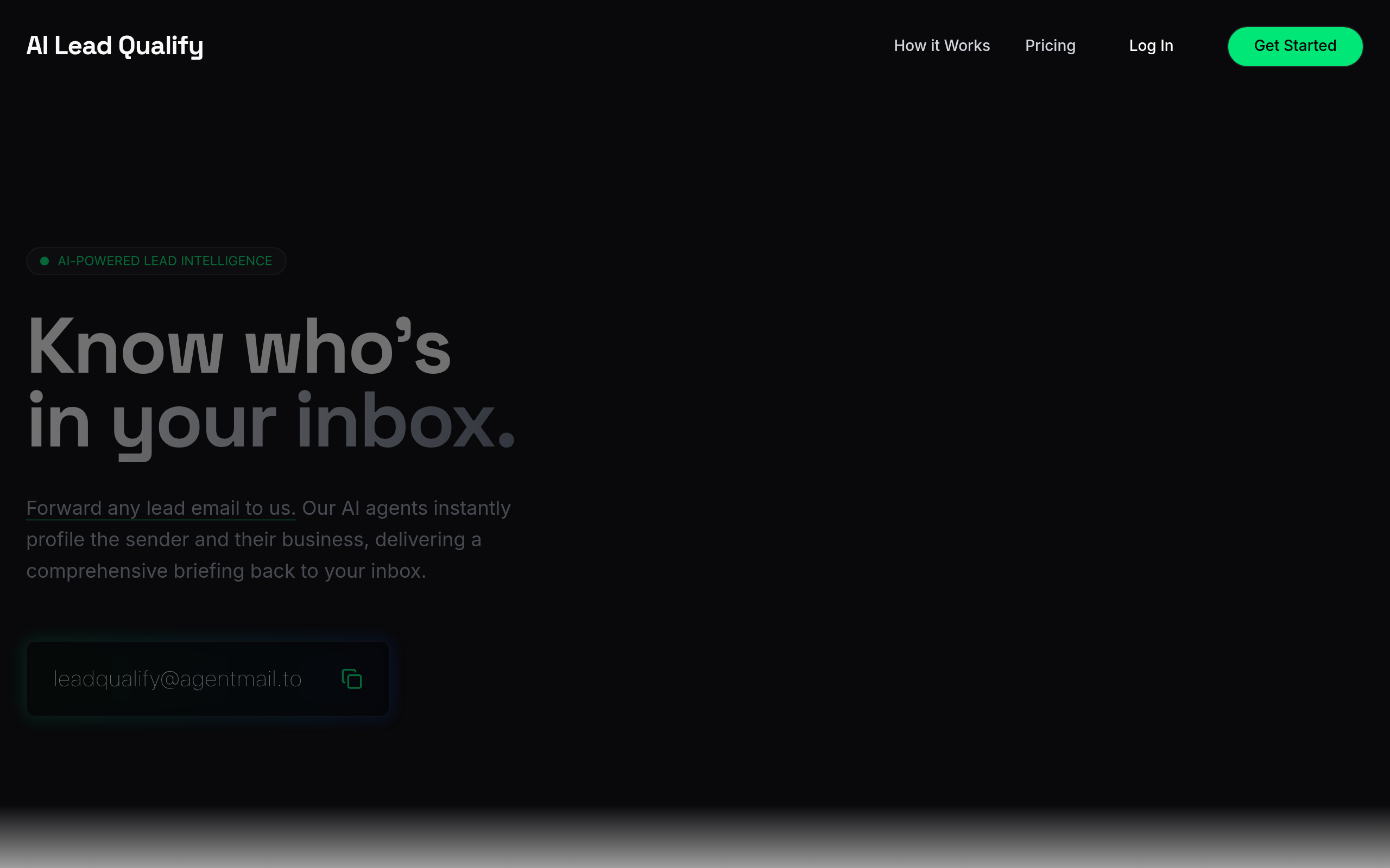 1. Forward any inbound lead or inquiry email to **[leadqualify@agentmail.to](mailto:leadqualify@agentmail.to)**. 2. Our AI analyzes the sender and researches their company using public data sources. 3. Wait a few seconds while the lead is processed. 4. Receive a clear, AI-generated summary back in your inbox with key details and context. 5. Use the insights to prioritize the lead and reply with confidence.