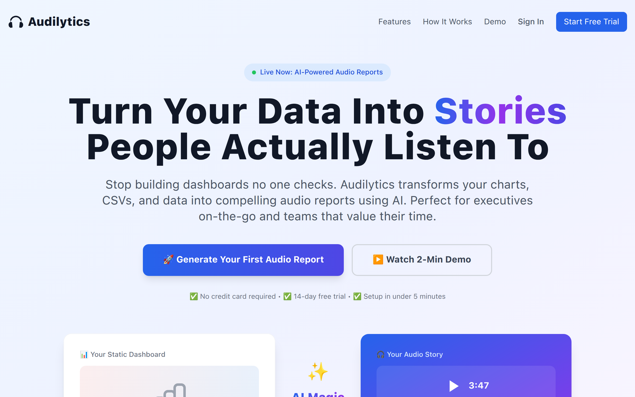 Audilytics is an AI-powered platform that transforms data charts, CSVs, and analytics into engaging audio reports. Perfect for busy executives and professionals who prefer listening to reading. Features: 25+ data source integrations (Google Analytics, Mixpanel, etc), automated podcast delivery, AI-powered narratives with business context, zero hallucinations - all claims are cited back to source data. Get instant insights delivered via Apple Podcasts, Spotify, or RSS feeds.