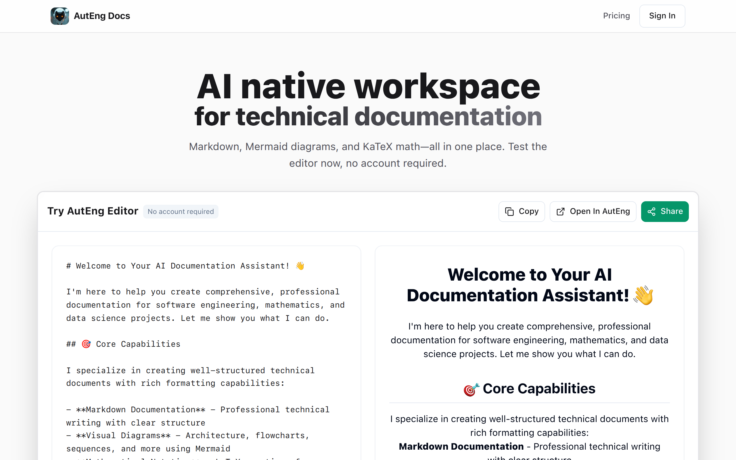 Built for engineers and scientists, AutEng offers an AI-native space to create and share technical, math, and physics Markdown. It supports KaTeX for formulas and Mermaid for visual diagrams, ideal for technical specifications, architecture docs, proofs, and physics summaries. It enables rapid drafting and improvement of Markdown.