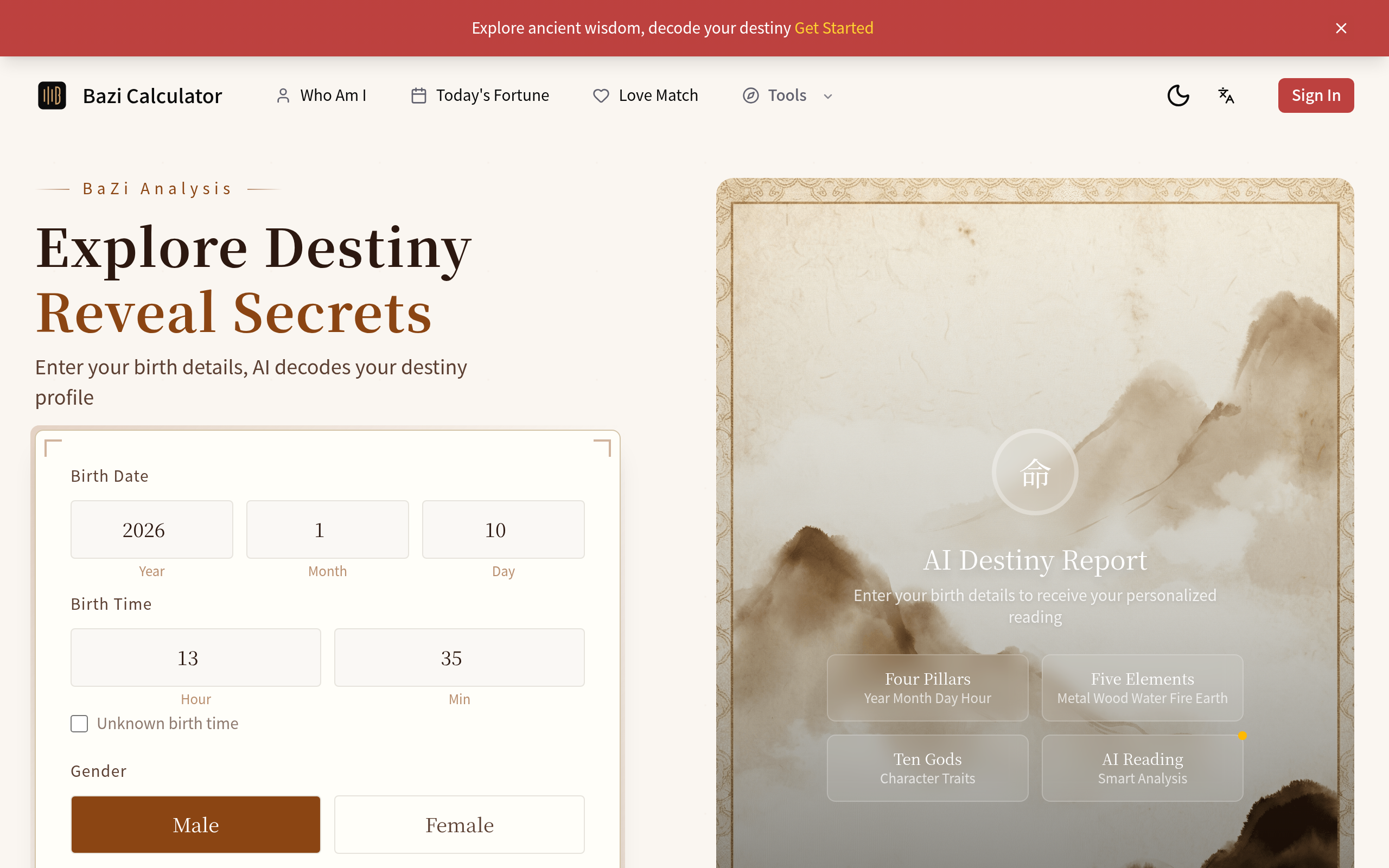 Free AI-powered Chinese Four Pillars (BaZi) destiny calculator. Analyze birth charts, daily fortune, and love compatibility with no login required.