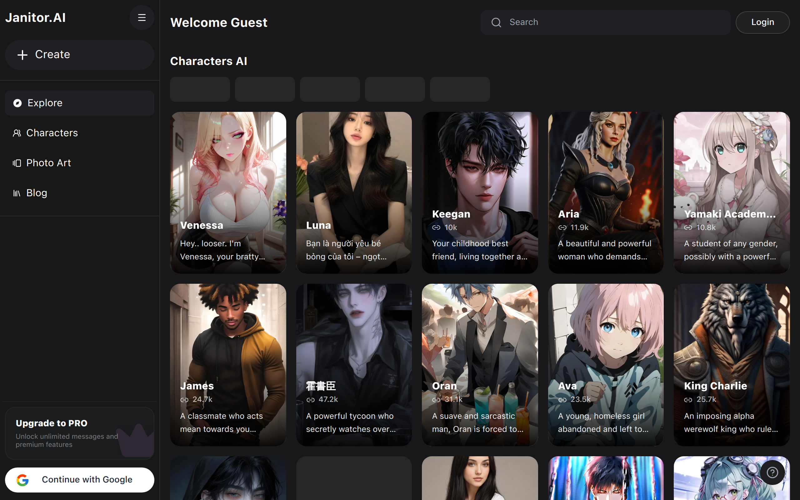1) Sign up or continue with Google and log in. 2) Browse the Characters gallery or create a new character — choose personality, backstory and behavior prompts. 3) Start chatting with the character to roleplay, test dialogue, or get companionship; refine the character’s settings as needed. 4) (Optional) Upgrade to PRO to unlock unlimited messages, premium photo art generation, and advanced customization.