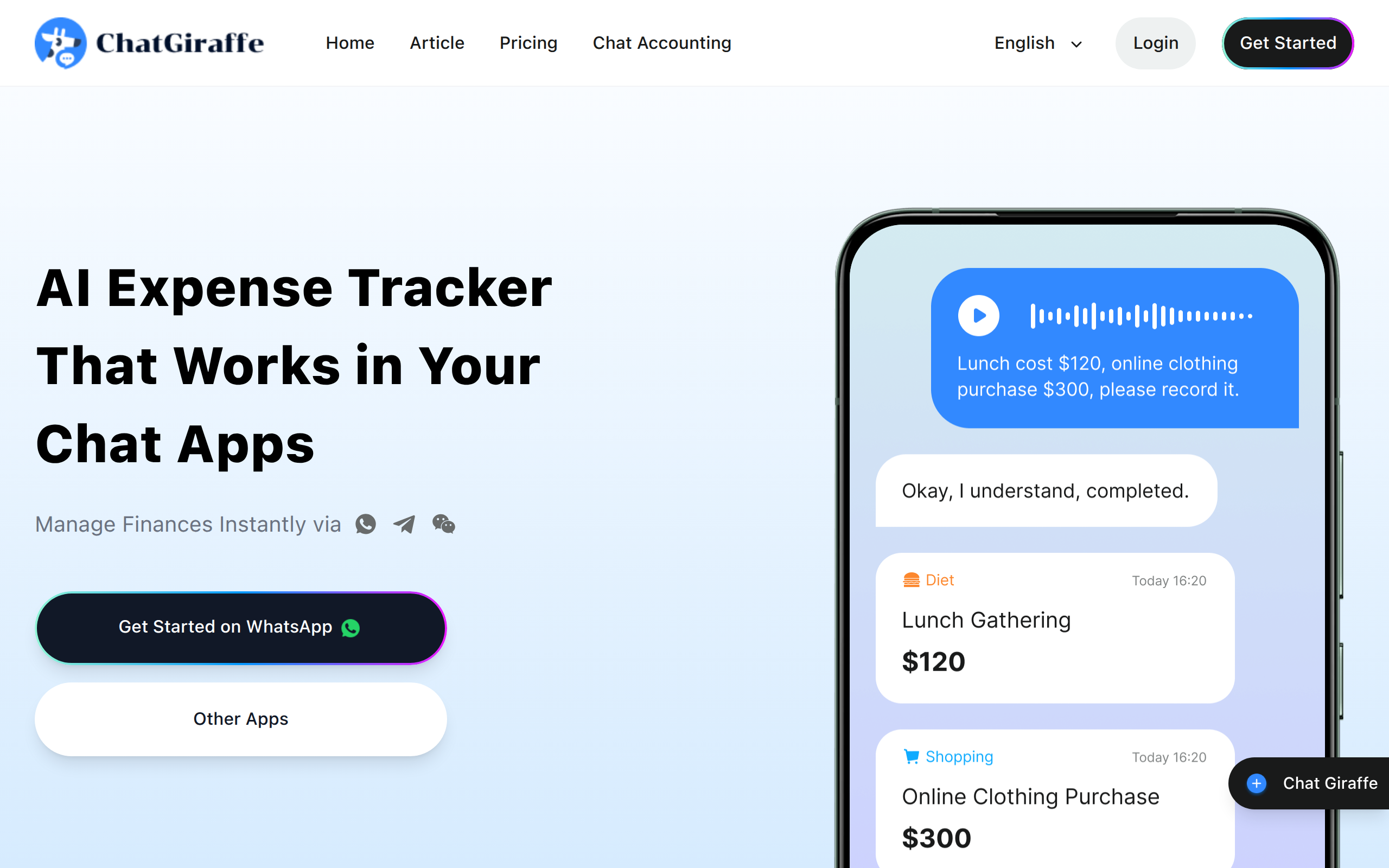 ChatGiraffe is an AI-powered bookkeeping app built around four core capabilities. Zero-Friction Capture: Accept voice, photos, and text inputs in any combination. Snap a crumpled receipt or speak while walking—AI automatically extracts amounts, categories, and currencies. No manual field selection required. Multi-Currency Ledger: Record expenses in their original currencies without forced conversion. Thai Baht stays as THB, USD as USD. This preserves accuracy and matches bank statements, ideal for travelers, students abroad, and cross-border professionals. Conversational Recall: Retrieve records using natural language. Ask "How much on coffee last month?" or "Total spending in Tokyo?" for instant answers across categories and currencies. No filter menus needed. Dual-Mode Control: AI handles input; you keep control. All conversations generate dashboard charts and calendar views. Every AI entry can be manually reviewed and edited, combining automation with human oversight.