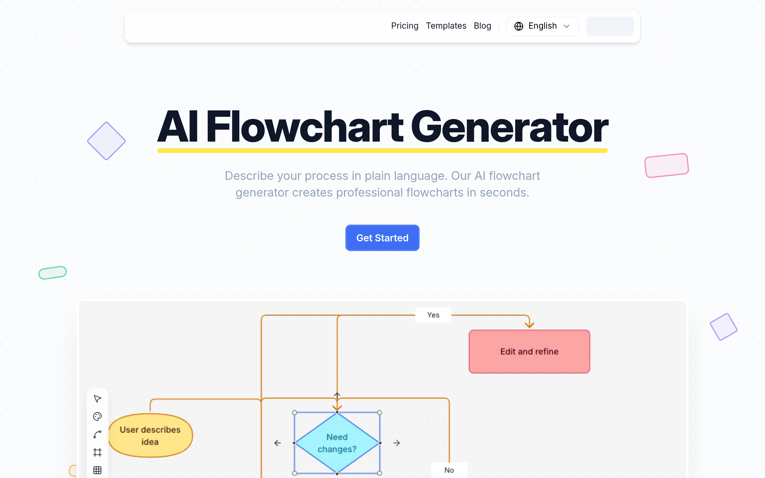 AI flowchart generator - describe your process in plain text or upload files (PDF, images, Word, PPT), get professional flowcharts in seconds.