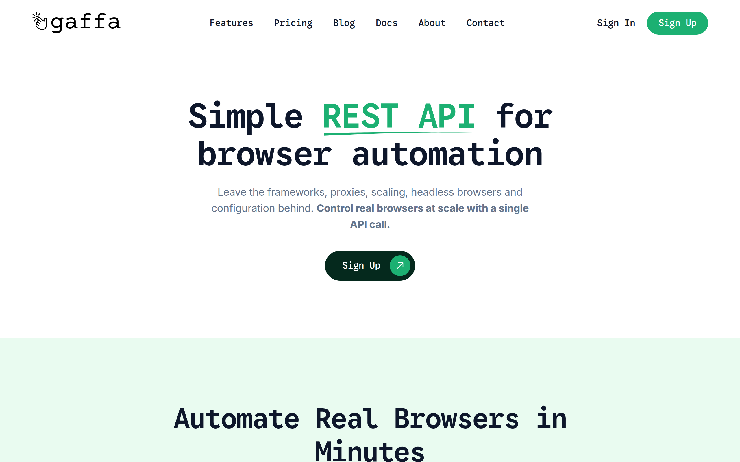 Getting reliable web data at scale is tough and getting harder all the time. Gaffa provides an API that makes it simple again. Gaffa will take care of all the complexity like residential proxies, scaling, infrastructure, failures and data parsing so you can concentrate on your business and not fixing broken scraping pipelines. Using Gaffa's REST API you can send a single request to perform a huge number of actions like scrolling and clicking mimicking natural human browsing patterns as well as extracting page data as images, markdown, html or, using LLM, JSON. Because Gaffa is designed to work even against the hardest to scrape sites it also has a stealth mode which uses real browsers, solves CAPTCHAs and uses residential proxies to ensure you get the data you need with minimum stress.