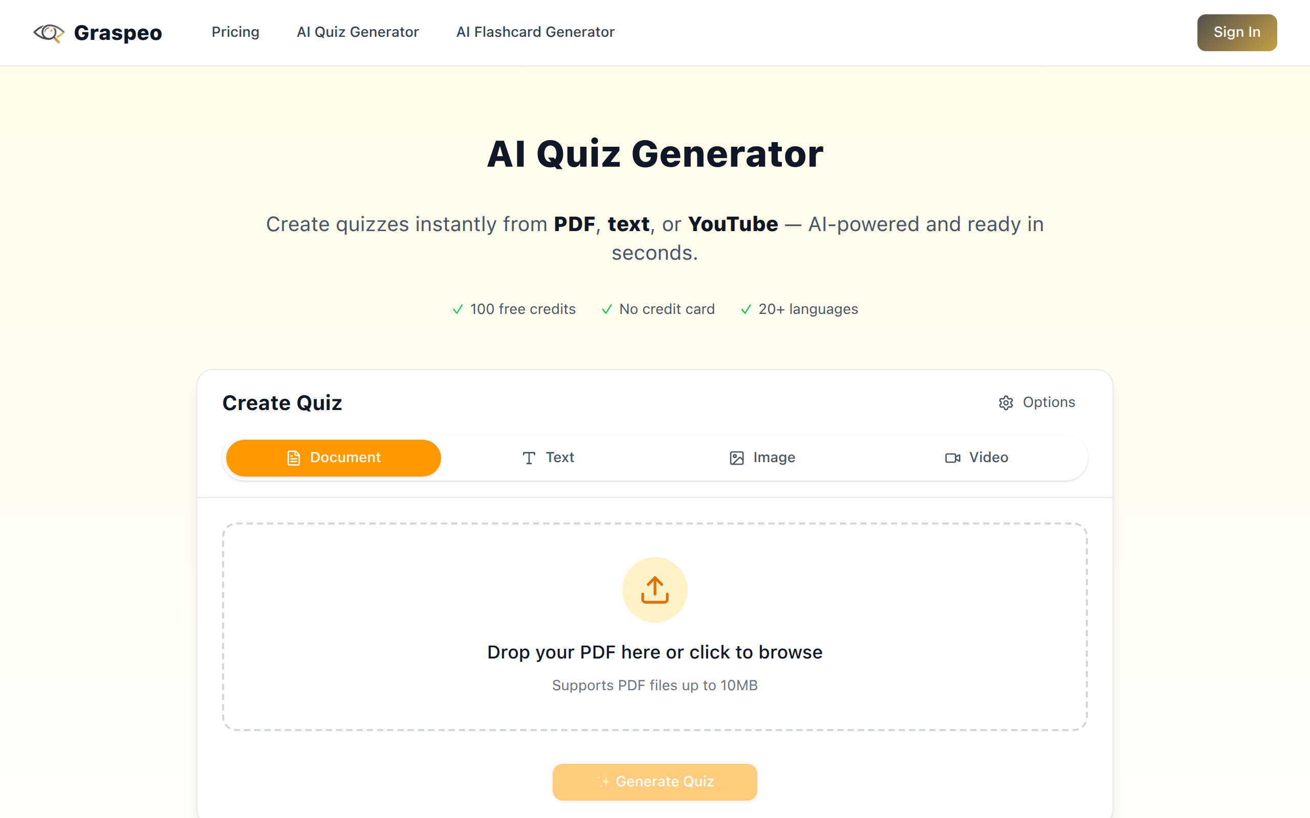 AI-powered study tool that turns PDFs, text, and YouTube videos into quizzes and flashcards instantly. Save hours of manual work.