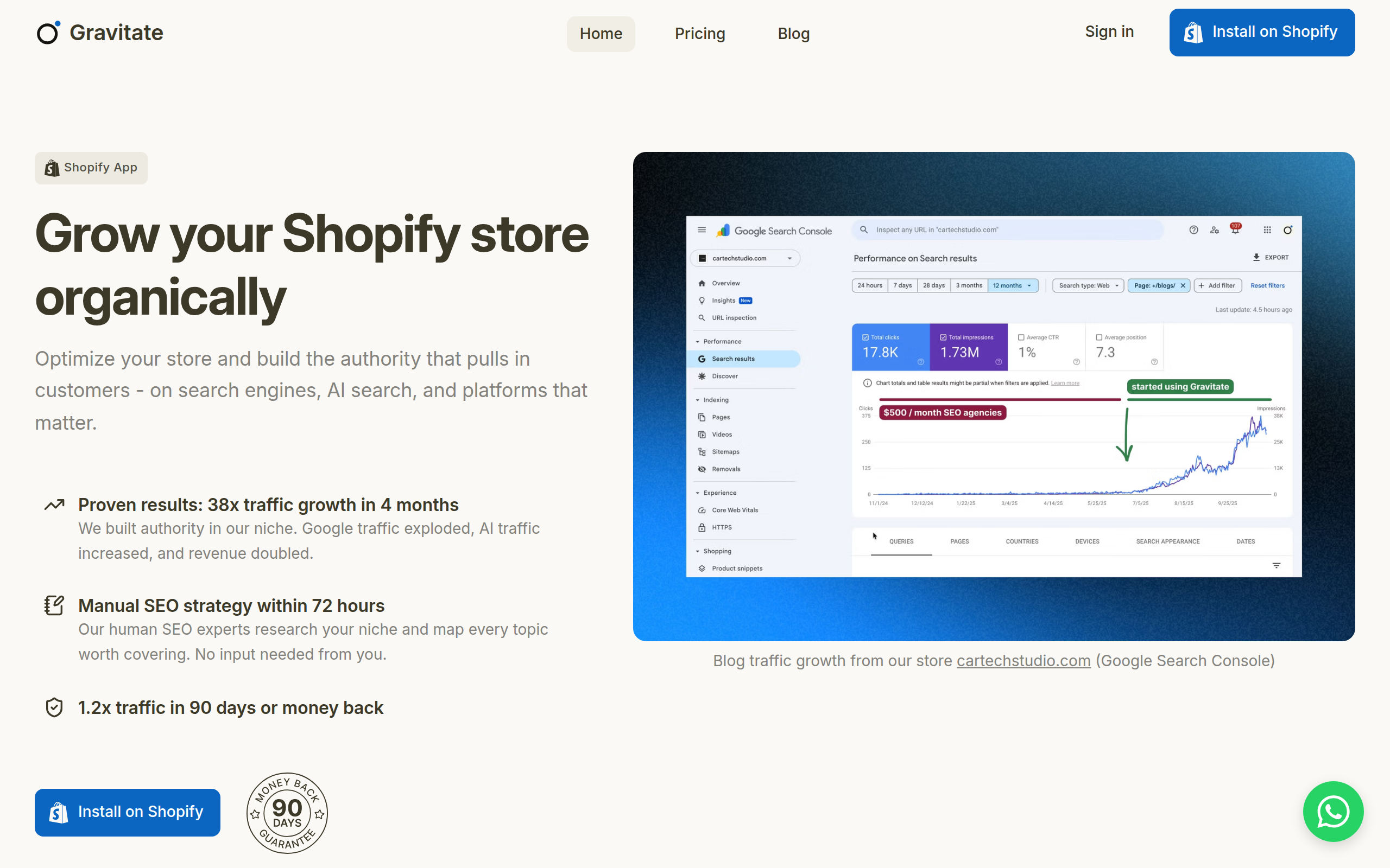 AI-powered Shopify SEO app. Get 1.2x traffic in 90 days or money back. Agency-level results starting at $109/month.
