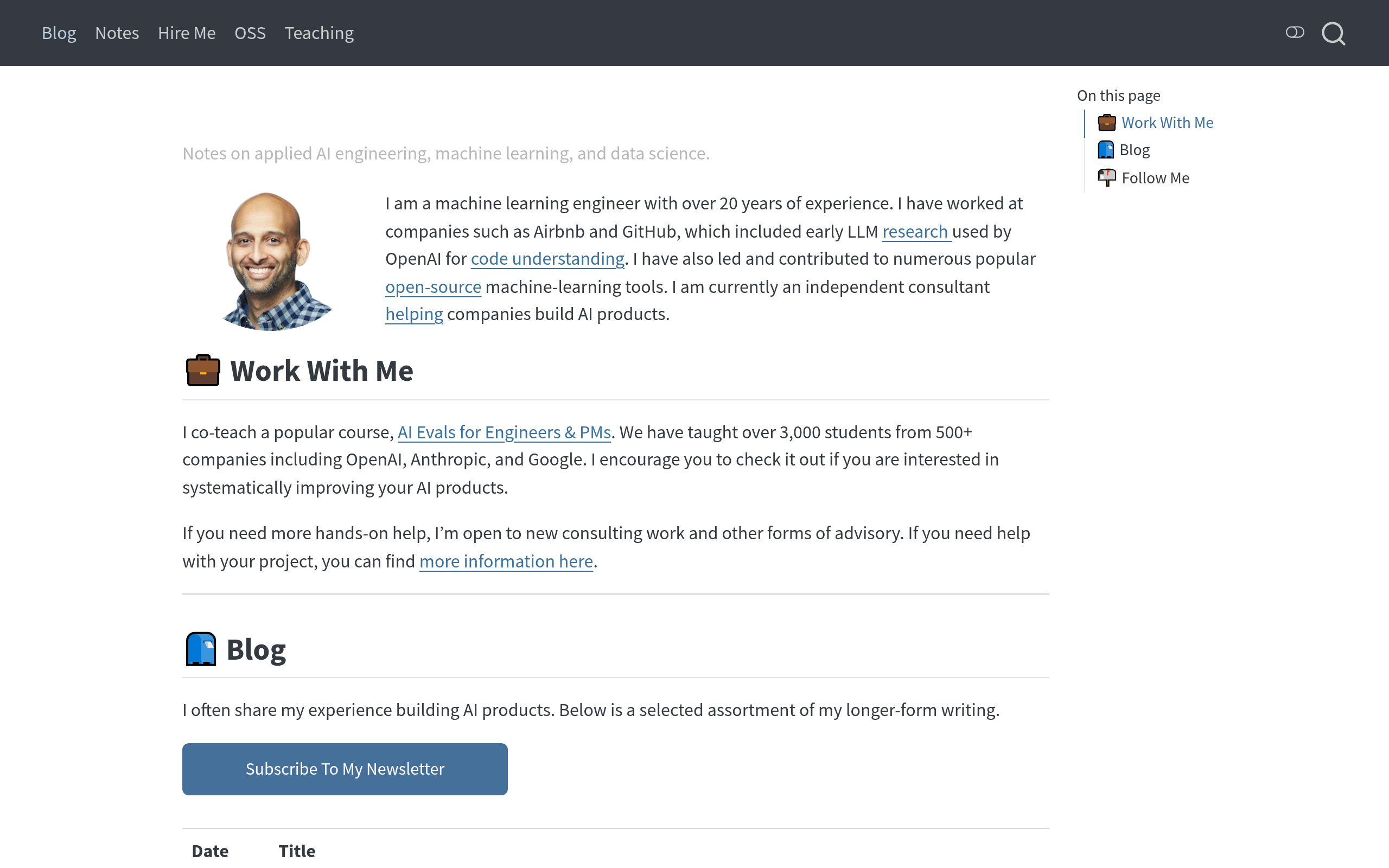 1) Browse the blog homepage or use the archive to find articles on evaluation, LLM best practices, and tooling. 2) Read detailed guides and follow links to referenced OSS projects or code samples for hands-on experiments. 3) Subscribe to the newsletter to receive new posts and updates. 4) If you need help applying the material, follow the 'Work With Me' / consulting links to inquire about the course or advisory services.