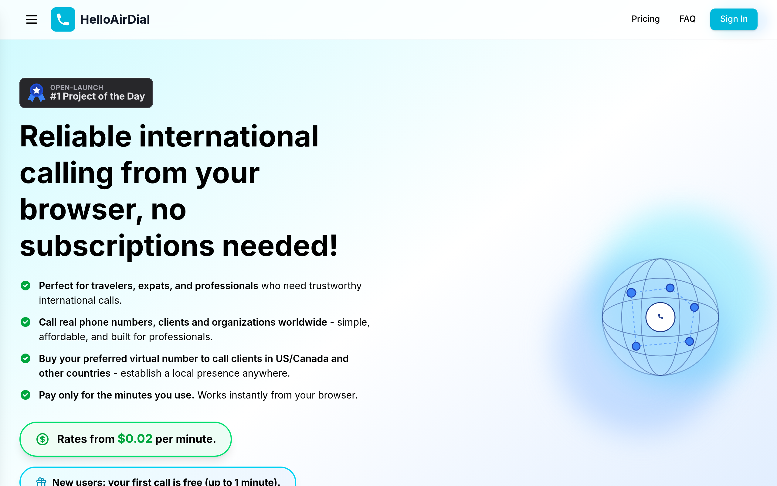 HelloAirDial allows professionals to make calls abroad to landlines and mobiles. International calling rates are cheap starting at $0.02/minute. Users can also buy virtual phone numbers to establish a local presence in destination countries. HelloAirDial works from your preferred browser and no setup is needed. Our pricing is simple with pay-as-you-use model without any hidden fees. We also support small and medium enterprises with our enterprise plan.