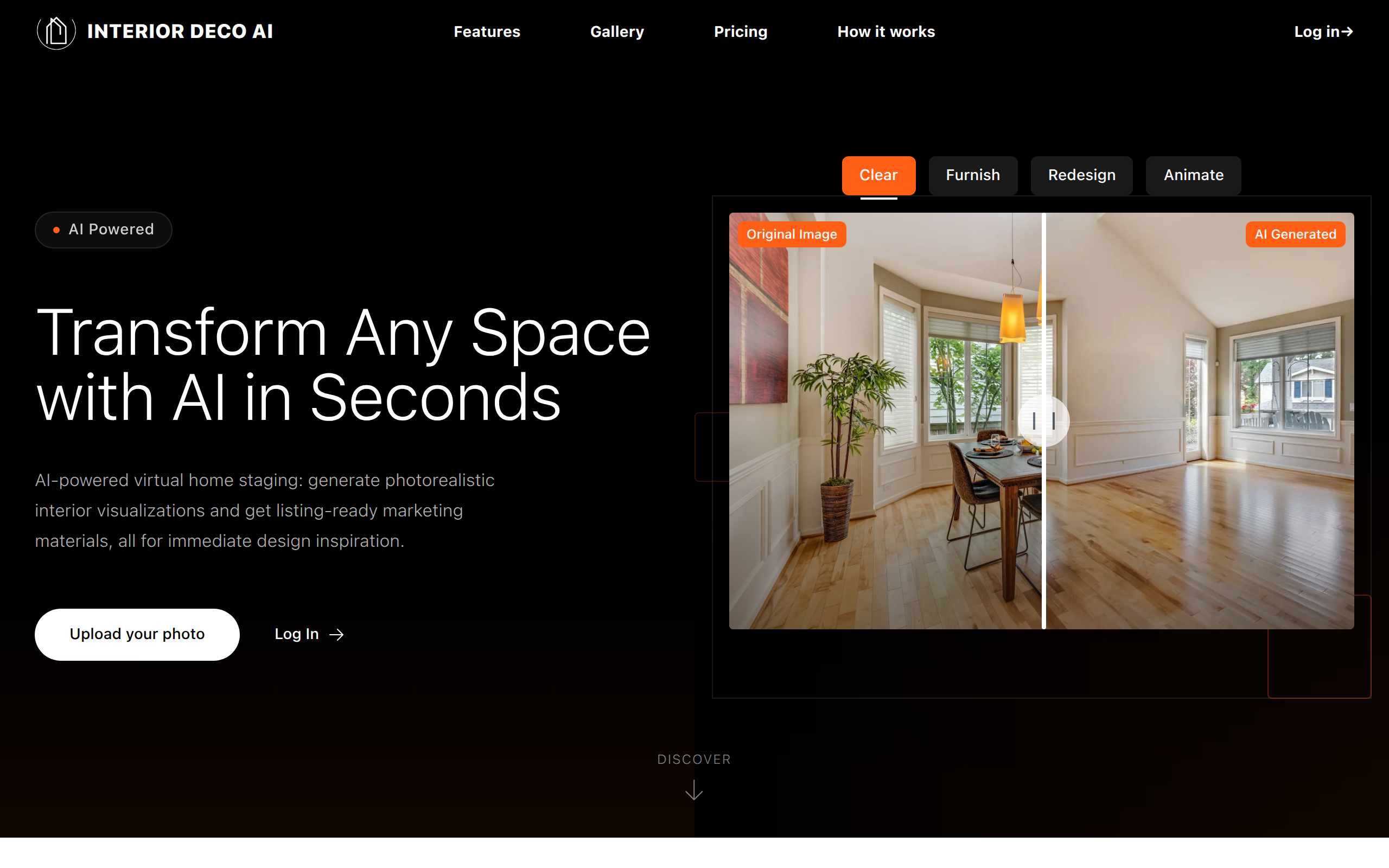 Interior Deco AI puts professional interior design at your fingertips. With just a few clicks, transform empty spaces into beautifully furnished rooms or refresh existing interiors with new decor and styles. Imagine seeing your living room in Scandinavian minimalist style, then switching to industrial chic or cozy farmhouse—all in seconds. Our powerful AI preserves your room's unique structure while applying designer-quality furnishings and decor. Real estate agents can instantly stage listings to attract buyers and increase property values. Homeowners can explore renovation ideas without the guesswork. Interior designers can quickly create concept visuals for clients. You can even remove all furniture from existing rooms, enhance image quality, or create engaging animations that bring your spaces to life. The possibilities are endless! No design experience needed—just upload your photo and watch as Interior Deco AI transforms your space into something extraordinary.