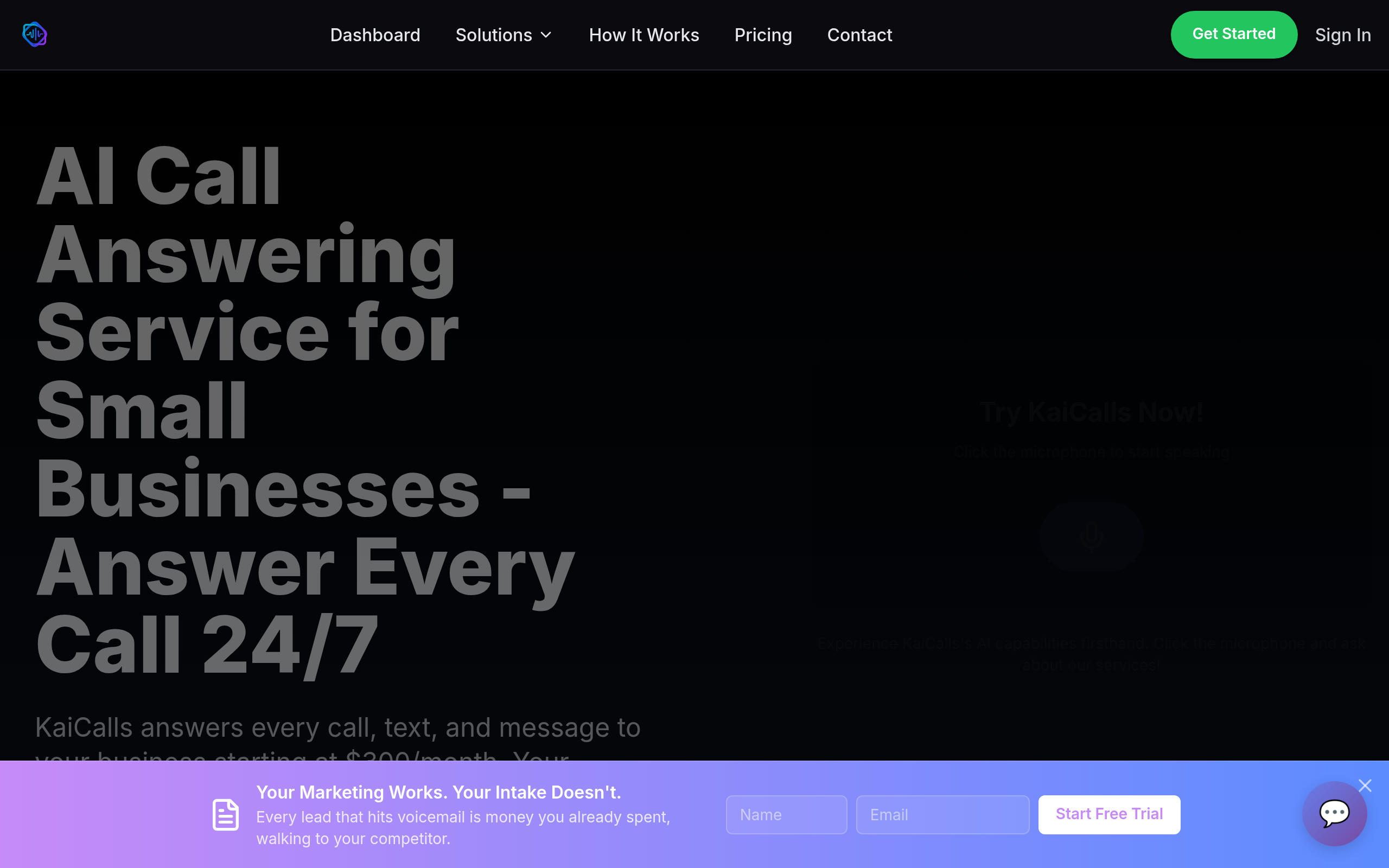Kaicalls is an AI-powered virtual receptionist for service businesses. Our intelligent voice agents answer unlimited calls simultaneously, qualify leads as Hot/Warm/Cold, send SMS follow-ups, and book appointments directly to your calendar. Built for law firms, HVAC contractors, medical offices, and real estate agents who can't afford to miss calls. Integrates with Salesforce, HubSpot, GoHighLevel, and 5,000+ apps via Zapier. Save 80-90% compared to hiring staff. Setup takes 5 minutes. No contracts.
