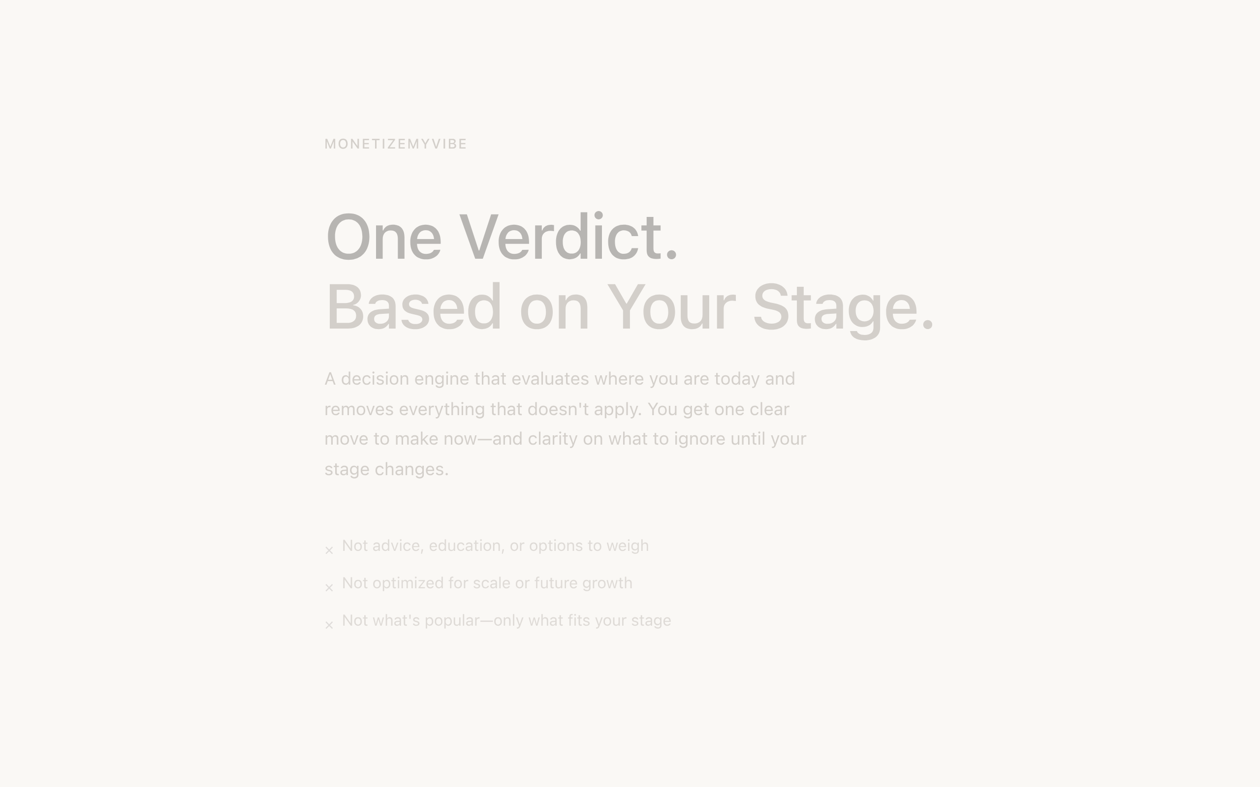 MonetizeMyVibe helps creators stop guessing how to make money and start making the right move at the right time. Instead of generic advice, MonetizeMyVibe analyzes where a creator actually is — early, growing, or established — and delivers one clear monetization verdict based on readiness, leverage, and risk. It removes irrelevant options, distractions, and premature strategies that usually lead to burnout or failure. Creators answer a short intake about their content, audience, and goals. The system evaluates monetization readiness across multiple dimensions and returns a single actionable recommendation — whether that’s launching a product, focusing on growth, building leverage, or delaying monetization entirely. The platform includes: • Stage-aware monetization decisions • Free first verdict, credit-based ongoing use • Decision history and saved verdicts • Secure magic-link authentication • Stripe-powered payments and credit system