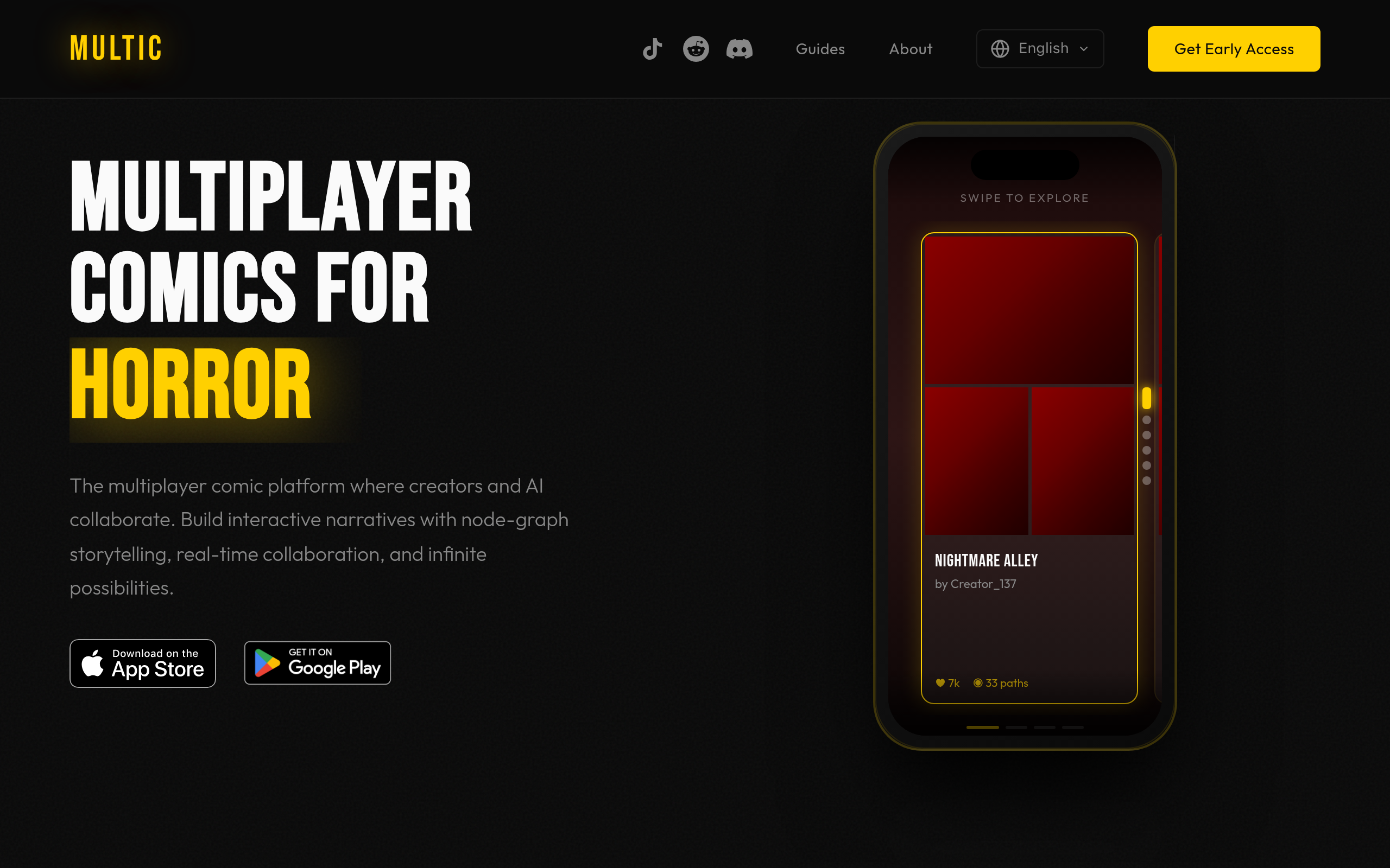 Multic: Multiplayer Comics for the Next Generation of Storytelling Multic is building Multiplayer Comics—a revolutionary visual medium that transforms how stories are created, shared, and experienced. Powered by our GenAI Game Engine, creators craft narratives through an intuitive node-based system where each node captures a story moment as a snapshot. These snapshots connect as graphs, enabling stories and entire universes to link together instantly. From Years to Minutes Traditional comics take years to produce and distribute. Multic reduces that to minutes. Our AI-assisted workflow handles the heavy lifting—generating images, scenes, and transitions in real-time—so creators focus on what matters: telling great stories. When your first release succeeds, you're not waiting years for a sequel. You're iterating within days, keeping audiences engaged and your best content evolving. Real-Time Collaboration, Real-Time Play Unlike static media, Multiplayer Comics are interactive. Multiple people can shape a story simultaneously—think collaborative game engine, but for visual narratives. Readers don't just consume; they participate, making choices that branch the story in real-time. This creates deeply personal, endlessly replayable experiences that traditional comics simply can't offer. Built for Scale Drawing from deep expertise in multiplayer gaming architecture, Multic takes a fundamentally different approach than traditional game engines. Rather than stress-testing real-time systems at massive scale, we sample snapshots that can speed up or slow down execution as needed. This makes supporting 100+ simultaneous participants significantly more scalable—without sacrificing the interactive magic. The Vision Ahead Today, we generate one image per second. Tomorrow: video-speed generation at 24fps. Beyond that: world models and fully immersive experiences. The node-based architecture gives us a unique advantage—additive speed control that traditional engines can't matc