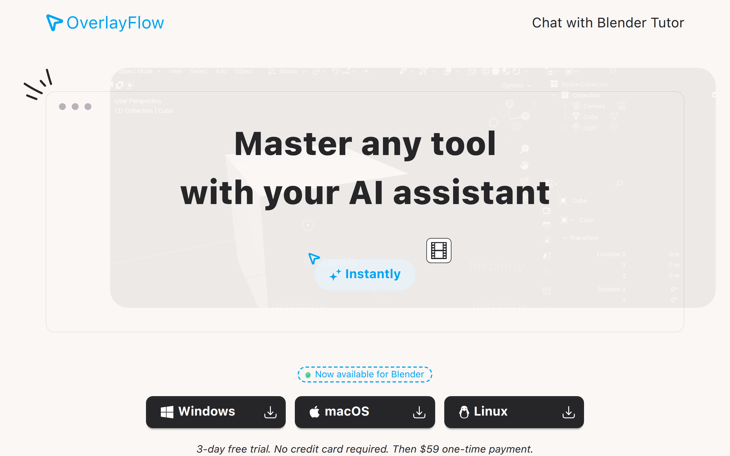 Built to integrate with popular desktop applications (example: Blender) so you get tailored guidance for the specific tool you're using.
