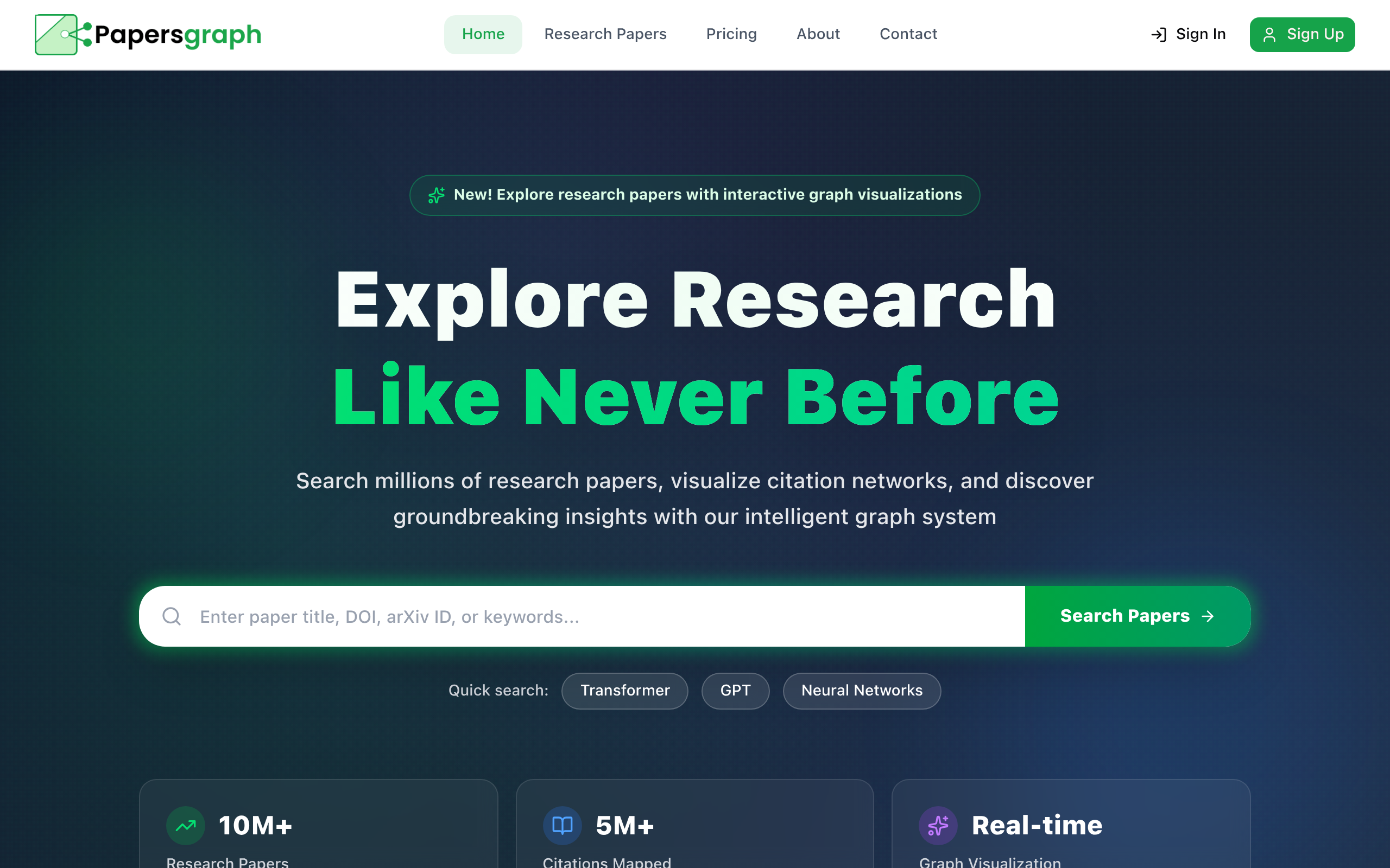 Search millions of research papers, visualize citation networks, and discover groundbreaking insights with our intelligent graph system