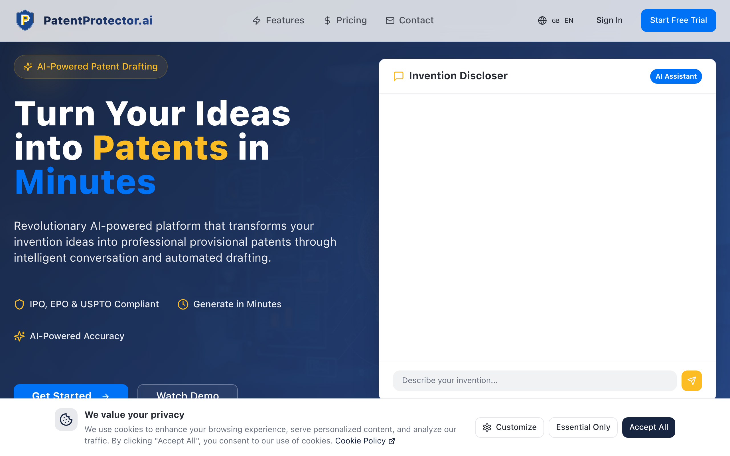 PatentProtector.ai is an AI-powered platform that uses advanced AI Patent Drafting to transform ideas into professional patent drafts within minutes. It streamlines provisional drafting, prior art summaries, and claim creation—helping inventors, startups, and businesses protect their innovations quickly and affordably. With automated accuracy and legally structured outputs, it makes patent filings faster, smarter, and far more accessible.