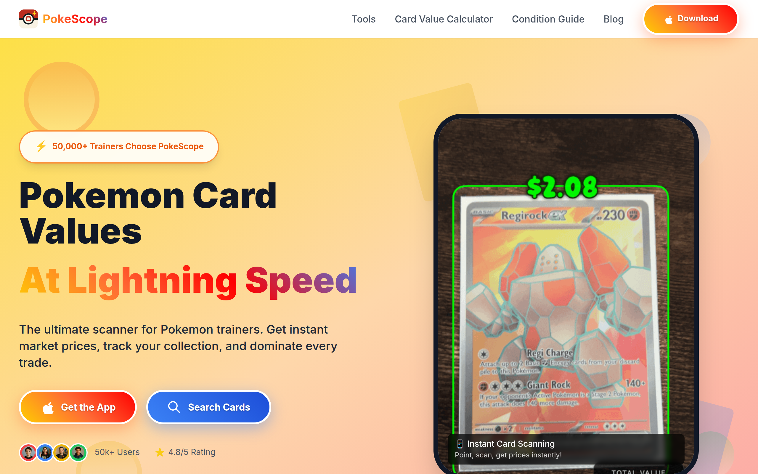 PokeScope is a free Pokémon card price checker website that helps collectors find accurate, real time card values. Instantly search any Pokémon card to view its raw and graded prices, track the latest eBay sales, and explore complete set lists, all powered by live market data. Whether you’re checking card values or browsing entire sets, PokeScope makes it fast and easy to stay informed. The PokeScope iOS app takes it further with a custom AI model trained exclusively on Pokémon cards, not a generic image recognition wrapper. It instantly identifies cards in real time using your camera and retrieves their current market value with remarkable accuracy. Collectors can quickly scan, verify, and compare cards on the go, saving time and eliminating guesswork. With precise live pricing and proprietary AI scanning, PokeScope is the most complete and reliable Pokémon card value tool available.