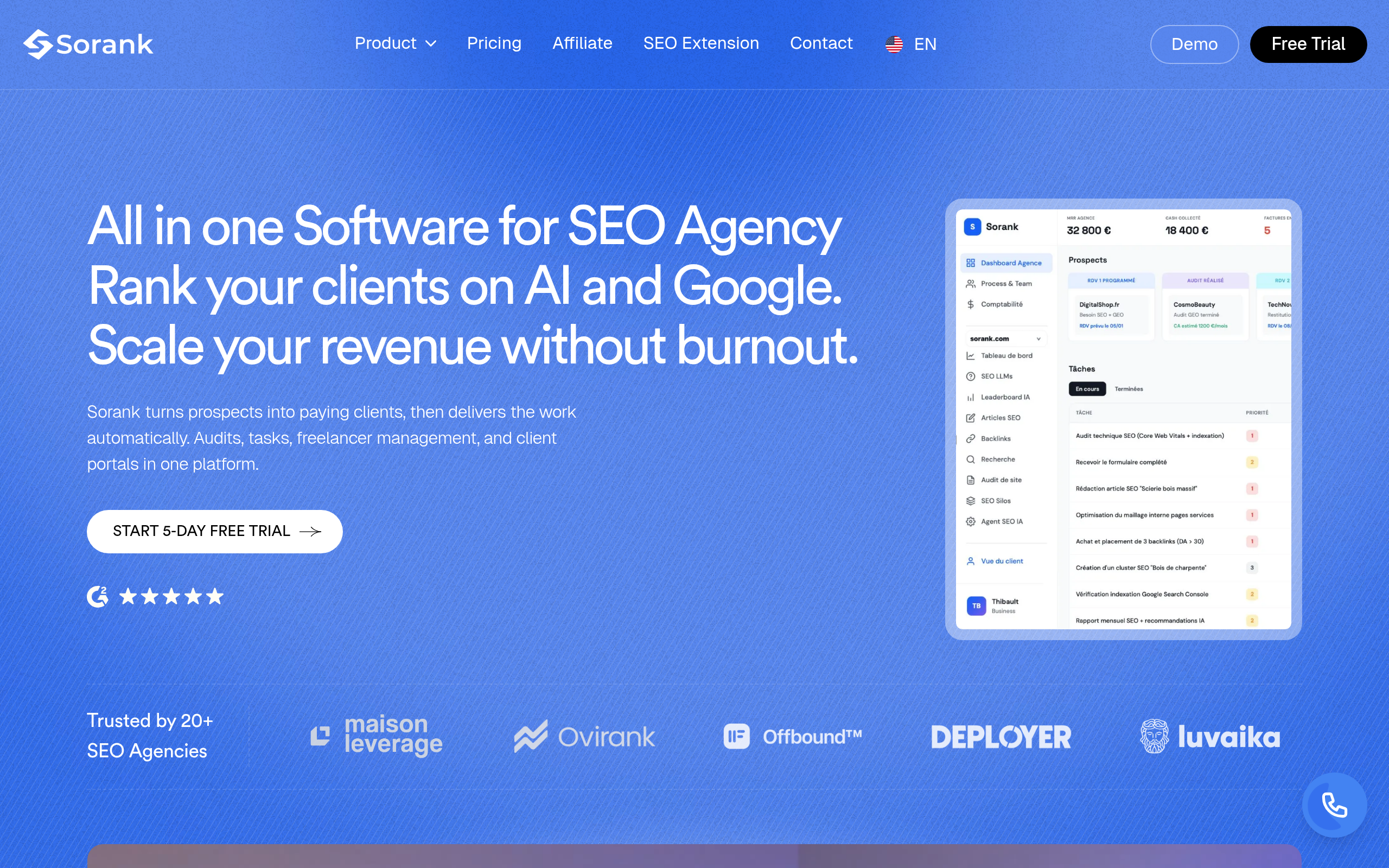 Sorank is an all-in-one SaaS platform built for SEO agencies who want to scale without burnout. Instead of juggling multiple tools like Semrush, Ahrefs, CRMs, and project management software, agencies get everything in one place: automated audits, task management, freelancer assignment, keyword research, backlink analysis, competitor monitoring, and white-label client portals. Enter a prospect's URL and generate a professional audit in minutes. Every recommendation automatically becomes an assignable task with deadlines. Clients see real-time progress through branded dashboards — no more status meetings or update emails. Built by an agency owner who nearly burned out twice, Sorank replaces approximately €2,500/month in stacked subscriptions with one platform starting at €99/month per client. Agencies report 27% higher conversion rates, 140% faster delivery, and 1.7x better client retention. Trusted by 20+ agencies worldwide.