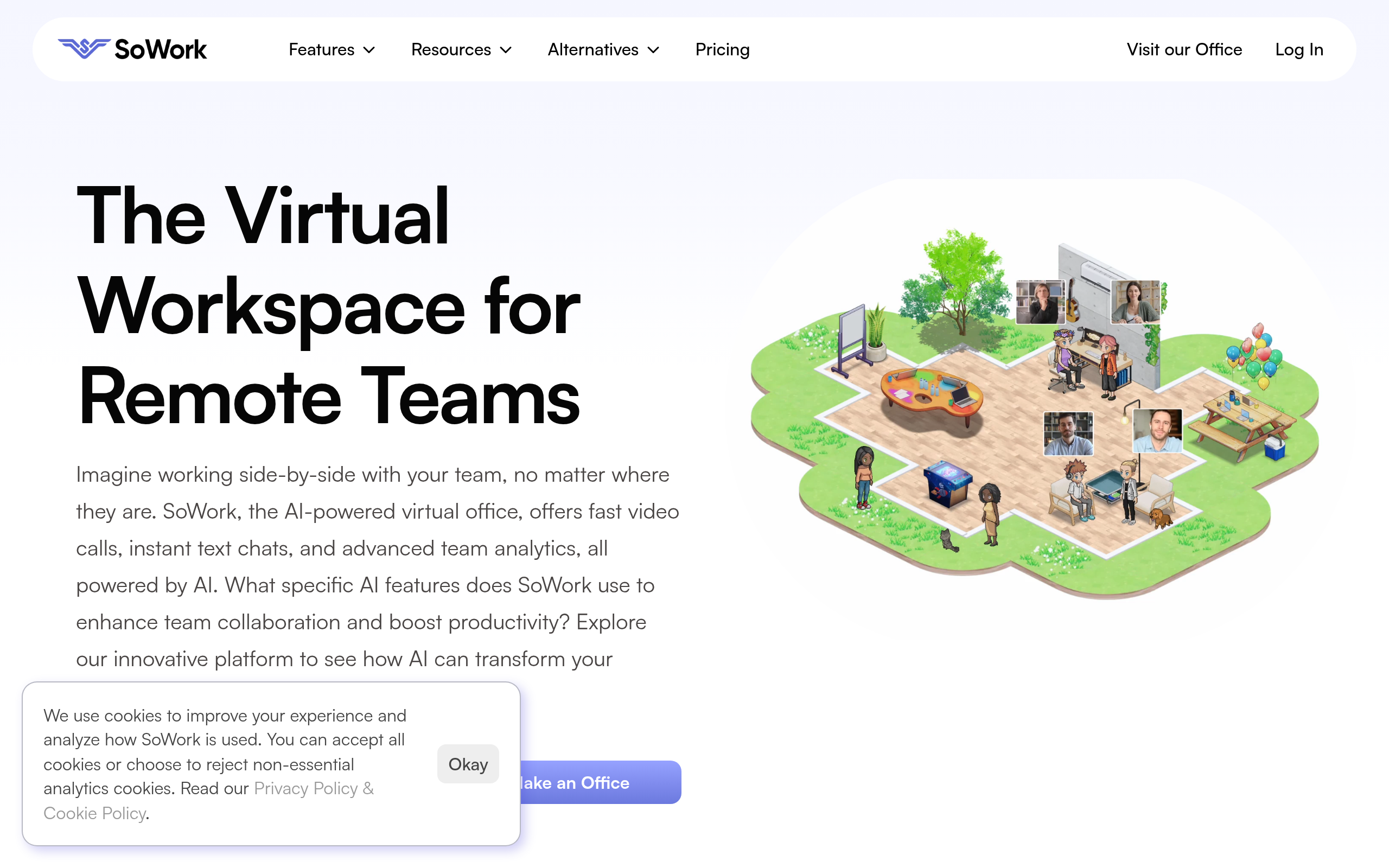 Remote and hybrid teams use SoWork as a continuous virtual workspace where they can truly feel connected. It merges a gamified environment with spatial audio, video, team messaging, analytics, AI features, and live presence to support natural communication and unscheduled collaboration.