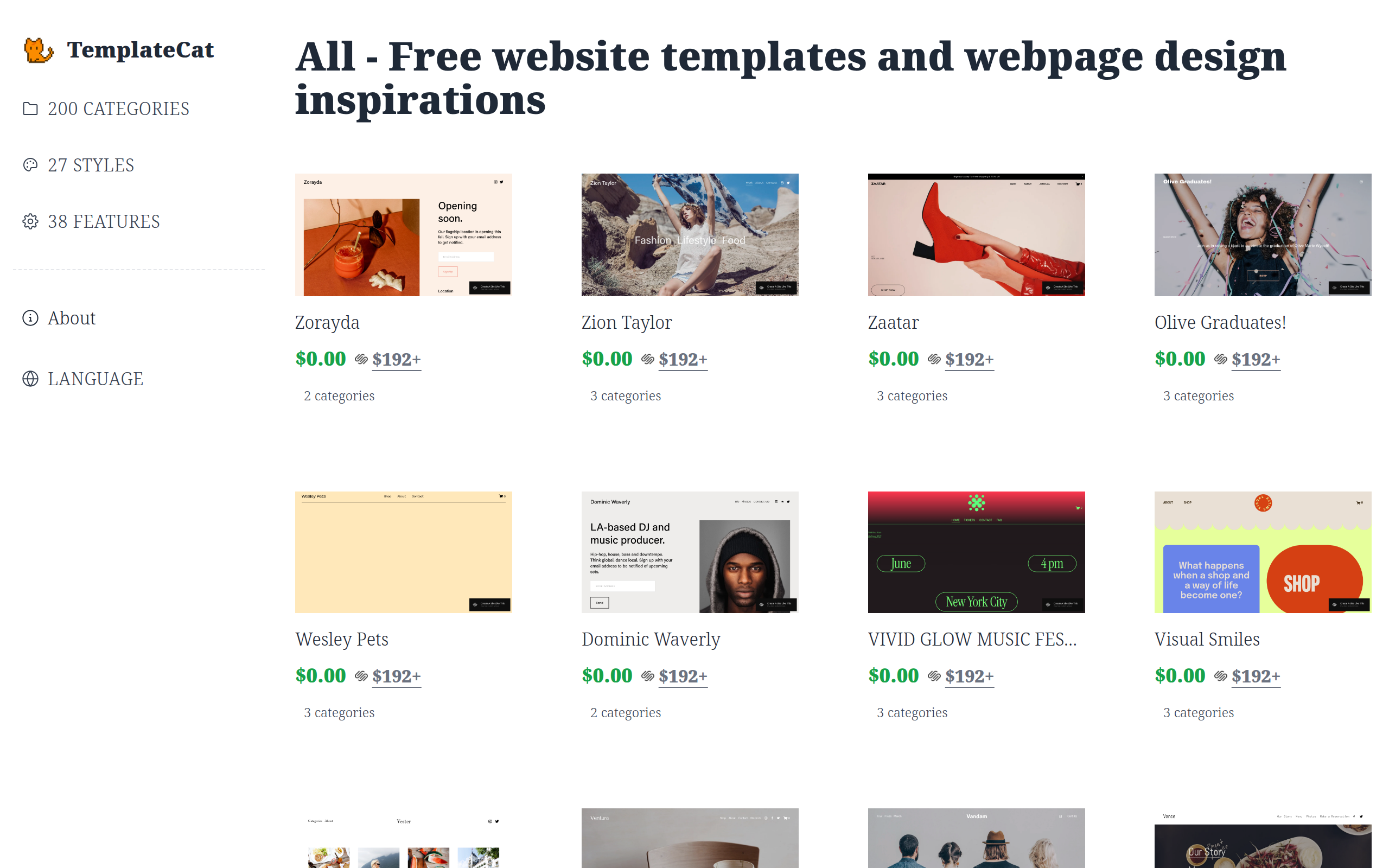 What is this? A little cat that helps you pick professionally designed templates. Just joking! It means "templates by categories". When doing web design for clients (eg. a dentist website), I often need to compare templates across different website builders. Jumping between platforms was really annoying, so I made this tool. Where are the templates from Framer Webflow Squarespace (Will add Figma Sites and Readymag later, I guess 10k+ templates in the future) What are the features? High quality templates - I only choose from website builder products where they hire professional designers. Browse by categories/features/styles - eg. find "portfolio" or "minimalist" templates On-page preview + device switching - directly see desktop/tablet/mobile effects Website builder pricing listed - easy to compare costs (Coming soon: pricing range filters, merge similar tags) Simply put: saves time jumping between different platforms to find templates.