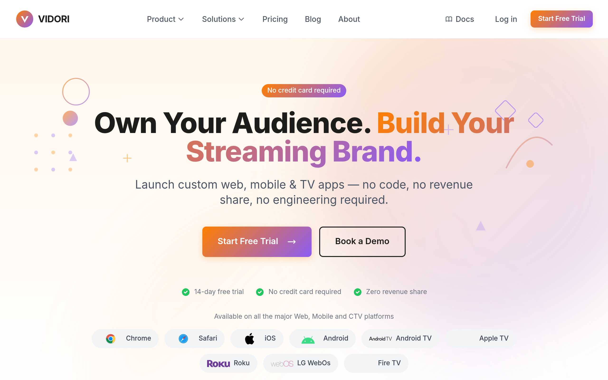 Vidori is a no-code platform that lets creators and media brands launch their own branded video streaming apps. Import your content, customize your app, set up subscriptions, and publish to iOS, Android, Roku, Fire TV, Apple TV, and 12+ other platforms — all from one dashboard. No developers needed, zero revenue share. Own your audience and keep 100% of your earnings.