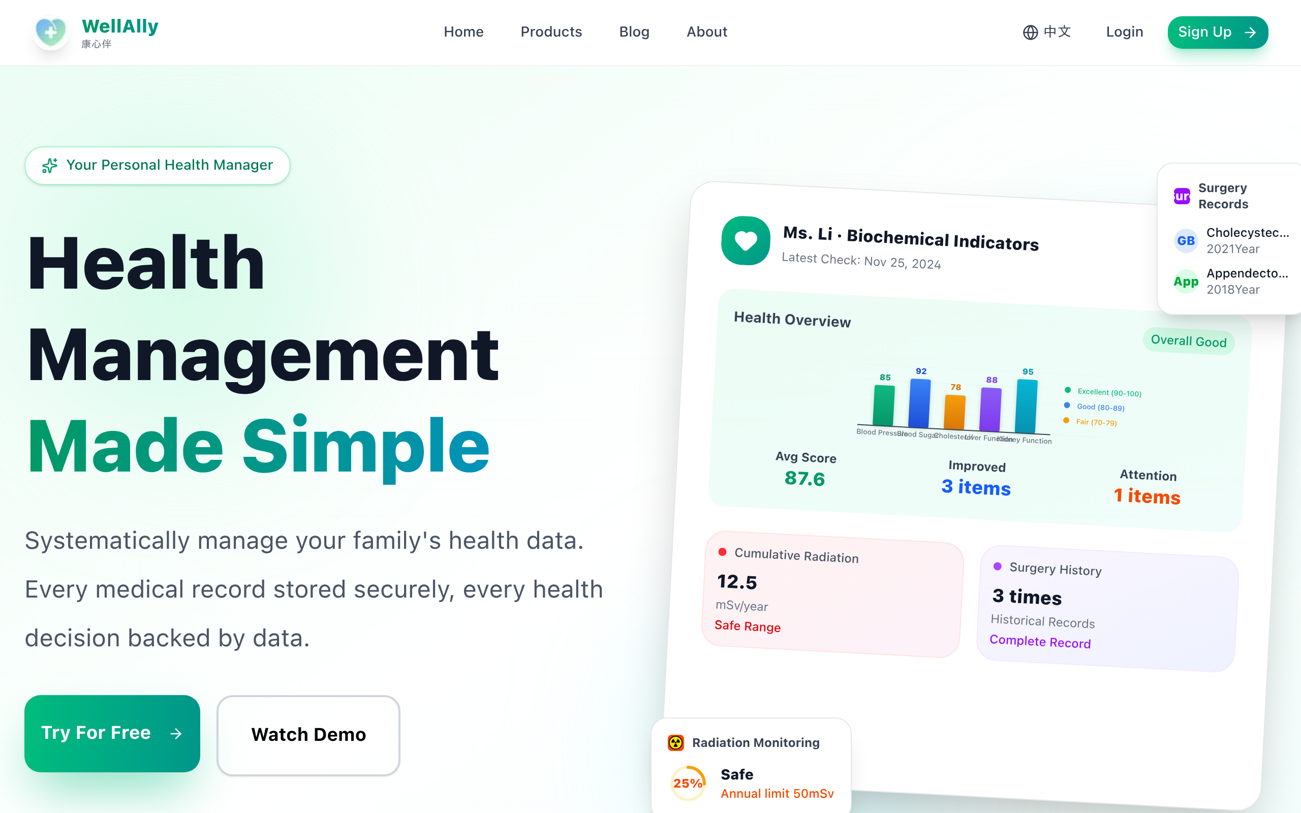 AI analyzes lab results and biochemical indicators, highlights abnormalities, explains trends and provides easy-to-understand insights and health score summaries.