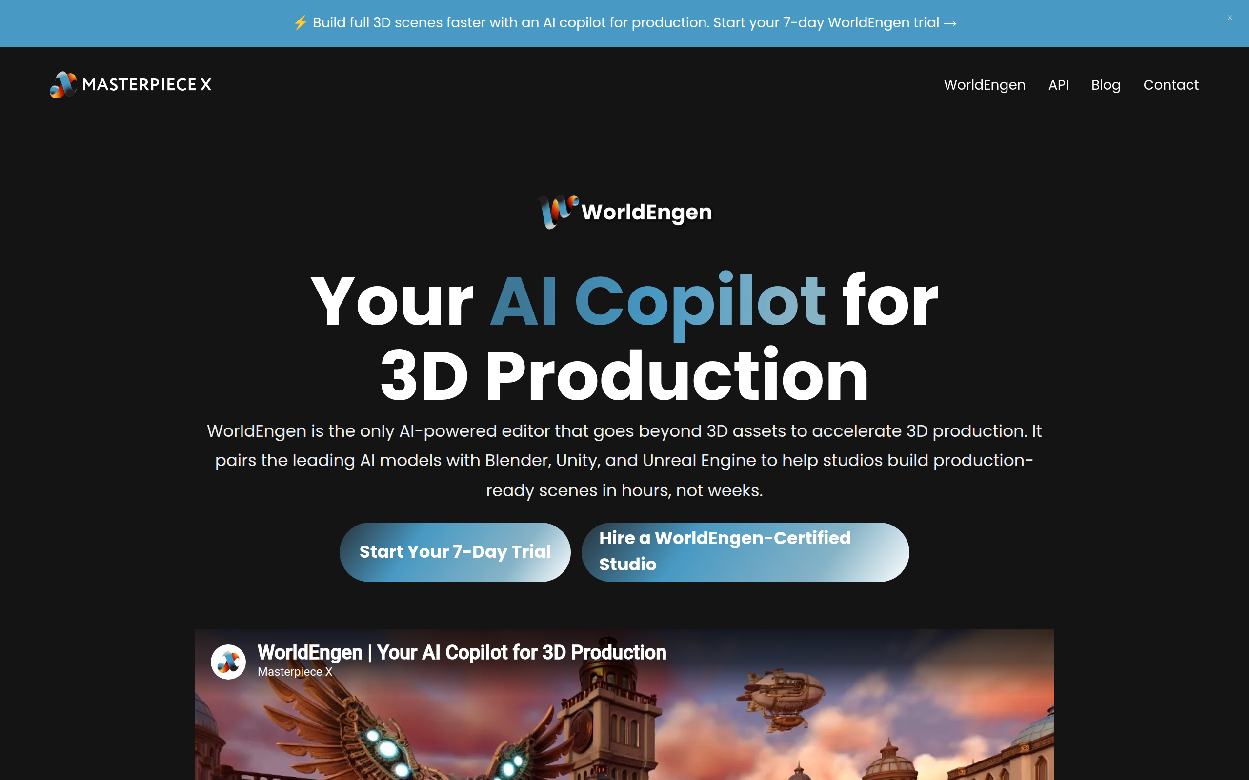 WorldEngen is an AI copilot for professional 3D teams to build, iterate, and ship full 3D scenes, not just asset WorldEngen is an AI copilot for 3D production that helps professional teams build complete, production-ready 3D scenes faster inside their existing workflows. Most AI tools generate individual assets. WorldEngen focuses on scene-level production. It enables teams to move from concept to finished 3D scenes in hours instead of weeks by bringing AI agents directly into a real-time scene editor. WorldEngen integrates with Blender, Unreal Engine, and Unity, allowing teams to build and iterate on full scenes without switching tools or breaking pipelines. AI agents assist with layout, scene assembly, iteration, and consistency while creative teams remain in control. The platform is designed for creative directors, technical leads, and professional 3D teams in gaming, interactive media, trailing, simulation, and virtual production. It helps teams reduce production time, maintain consistent style and scale, and collaborate with AI as a creative partner rather than a standalone generator.