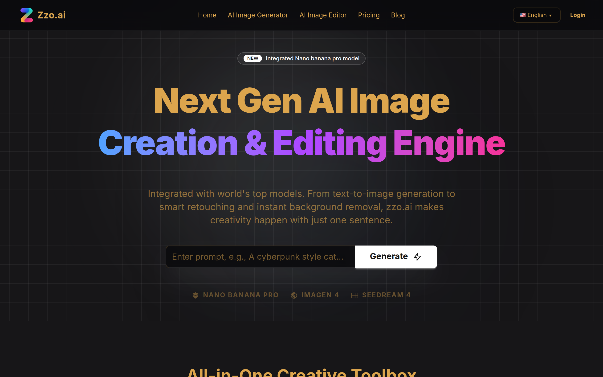 A: Zzo.ai is a free all-in-one platform that combines AI image generation and professional photo editing tools. You can generate original AI art from text descriptions, edit and enhance photos with AI-powered tools, remove backgrounds, apply artistic styles, retouch images, and create stunning visual content - all in one place.